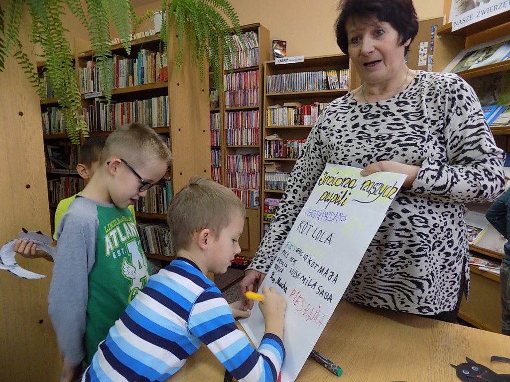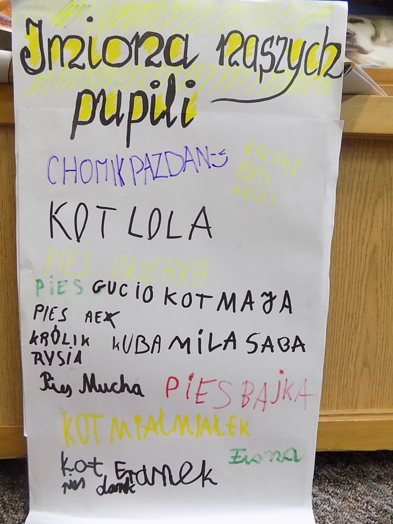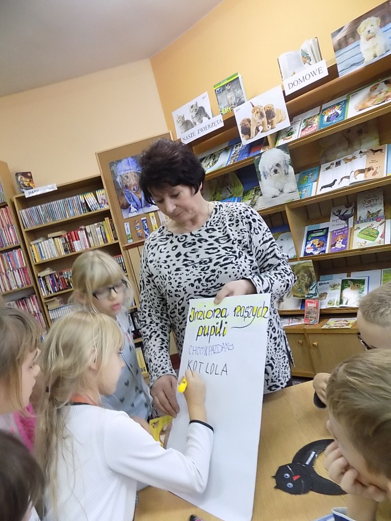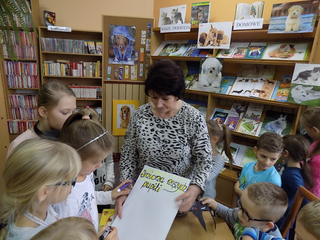 02 lis 2016 Autor: Aneta Możdżanowska Kategoria: Aktualności, Filia Biblioteczna nr 3 Tagi: Fb 3W nawiązaniu do filmu, który obejrzeliśmy w kinie i ostatniej naszej pracy – Kot , odbyła się lekcja biblioteczna poświęcona naszym pupilom. Dzieci bardzo chętnie opowiadały o swoich zwierzętach domowych i opiece nad nimi. Każdy przedstawił nam swojego pupila zapisując na przygotowanej tablicy jego imię. Dzieci jednogłośnie stwierdziły, że wszystkie zwierzęta niezależnie czy te małe, duże, kudłate czy łaciate są wspaniałe. Niezwykłym okazało się to ,że wiele zwierząt było wziętych ze schroniska albo zostało przygarniętych z ulicy.